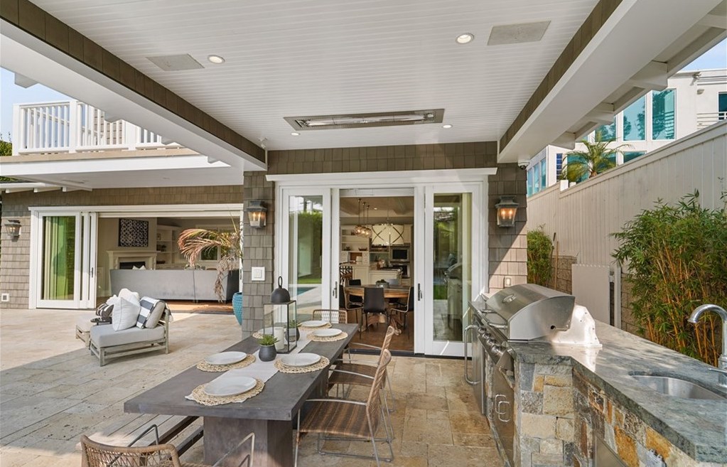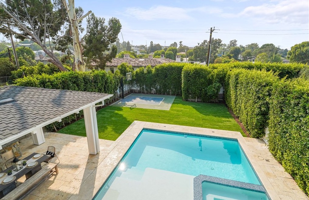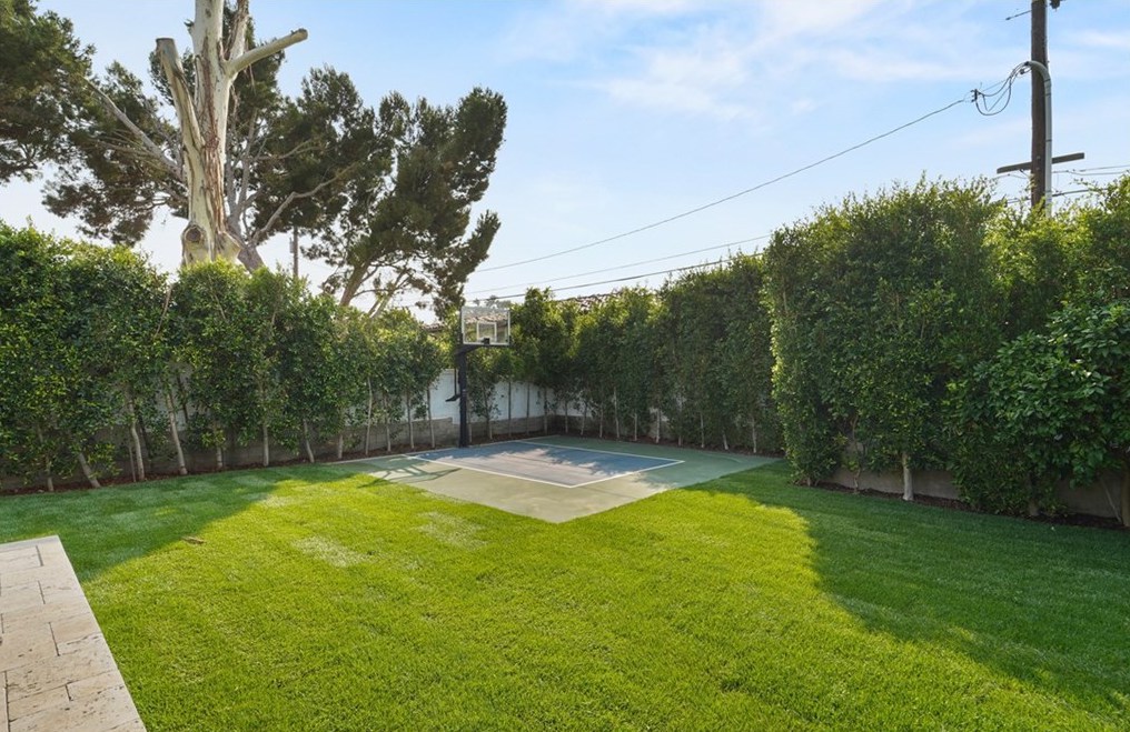 Upstairs, a sky-lit landing leads to the primary suite. One of five bedrooms and five bathrooms in the two-story interior, it expands to a spacious deck overlooking the neighborhood. In the backyard, 15-foot privacy walls and hedges surround a swimming pool, spa, dining patio and lawn. The basketball court is tucked at the edge of the property.